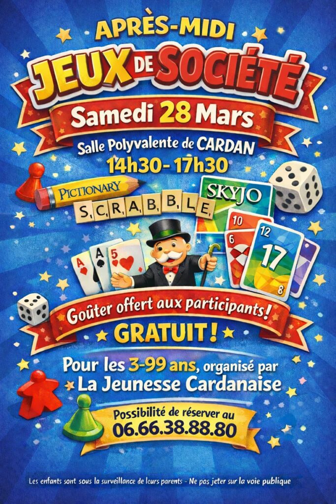 La Jeunesse Cardanaise organise une après-midi « Jeux de Société » le Samedi 28 Mars à partir de 14h30. L’occasion de jouer en famille ou entre amis, sans écrans ! Goûter offert aux participants ☕